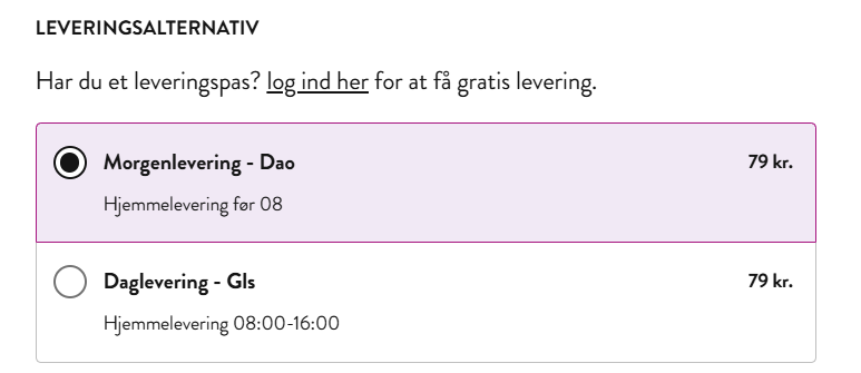 Når du er logget ind, kan du bladre igennem udvalget og vælge den vare, du vil bestille. Når du har valgt det produkt, du ønsker, skal du sætte en foretrukken leveringsdato. Indtast derefter leveringspostnummeret i det relevante felt. Når du indtaster postnummeret, vises en rullemenu med mulige leveringsadresser; Vælg den korrekte adresse fra denne liste. Efter at have gennemført disse trin, vil du blive tilbudt to leveringsmuligheder. Det er vigtigt at bemærke, at som vist i eksemplet nedenfor, indikerer det, at du ikke er logget ind på din konto i øjeblikket. Login er påkrævet for at udnytte alle tilgængelige leveringsmuligheder og fordele.